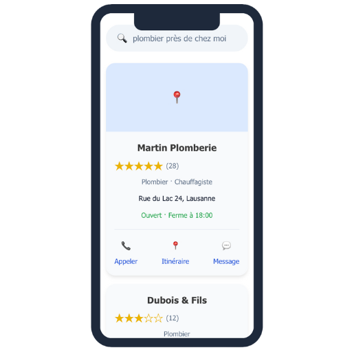 Votre entreprise apparaît immédiatement lorsque des clients potentiels recherchent vos services dans votre zone géographique.